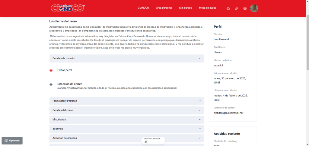 Mantener su perfil actualizado en el Campus Virtual del Politécnico CIANDCO es esencial para garantizar una experiencia fluida y profesional tanto para usted como para sus estudiantes.